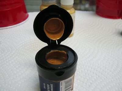 Next, I checked out the Vallejo Game color gold paint. The bottle was definitely older, so I shook it pretty well. The bottle was still clogged, so I gave it a couple whacks again. The bottle opened up, and I dropped some paint on my “palette”. The paint was “buttery” looking in the bottle, and came out looking a little “flat”. Here’s a good look at how it comes out of the bottle. I’ll be honest; I was worried I did not mix the paint enough because it just didn’t look “right”.